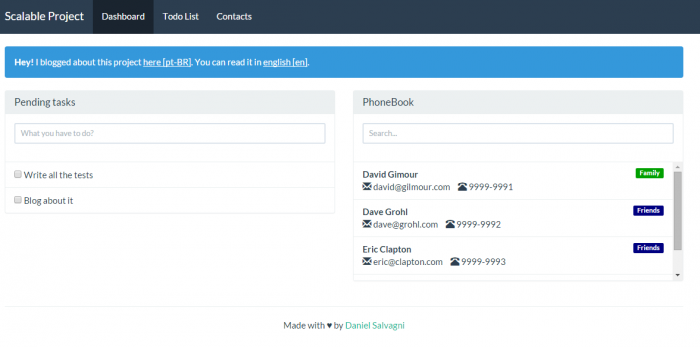 Uma das minhas preocupações quando comecei a criar este modelo foi permitir que ele fosse “testável”, e é. É possível testar toda a aplicação com testes unitários utilizando o KarmaJS e testes end2end utilizando o Protractor.