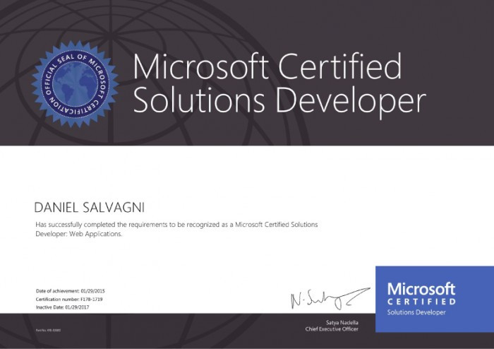 Encerrei o mês de janeiro de 2015 com o título de MCSD: Web Applications, o que me qualifica para a posição de desenvolvedor web ou administrador web, com o reconhecimento da minha especialização em criar e implantar serviços e aplicativos modernos com a tecnologia Microsoft.