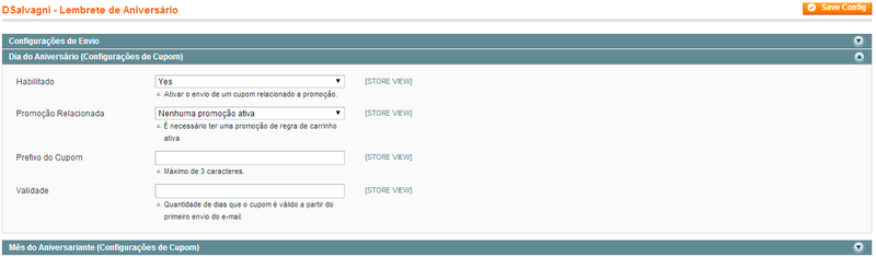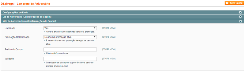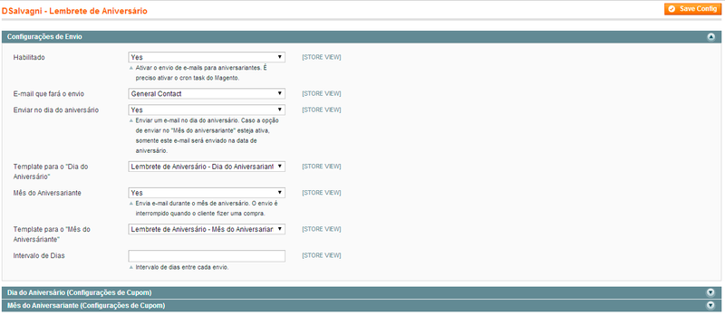 Com o cron job habilitado, toda vez que for acionado será verificado se há algum cliente de aniversário na data ou no mês atual. É possível que seja enviado um código de cupom para o e-mail do dia do aniversário e outro para o mês do aniversariante. O cupom será relacionado a uma promoção existente, assim, configurável conforme os padrões de regras de promoção do Magento.